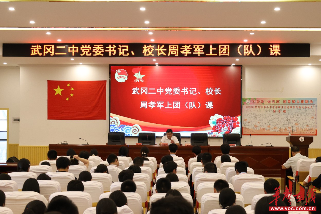 周孝军为同学们带来了一堂生动的团课——《明晰职责担当,争做青年表率》。他通过讲述武冈二中历史和“一修三入”的德育理念(传承中华优秀文化修身,赓续红色基因入脑,培育心理健康入心,培育实践劳动技能入行),激励同学们不仅要提高自身修养,更要做好学生服务工作,为学校、为社会、为国家贡献自己的青春力量。