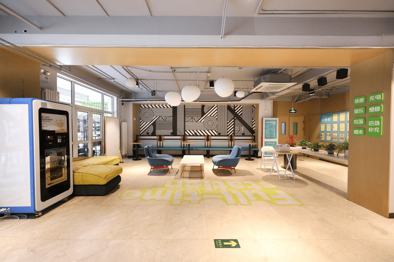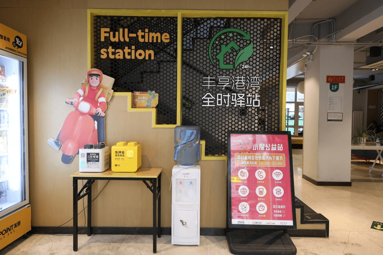 “丰享港湾”全时驿站通过精准化服务设计传递组织温度,卫生间、充电插座、应急药箱等设施,有效解决“在外奔波”人群的基础刚需,热水、休息椅等细节配置体现人文关怀。驿站创新构建“1+N”服务体系:一层设置服务台,同时配备快递柜,方便快递员办理业务;二层配备健身房、休息厅、图书角和投影设备,定期开展党员学习活动,满足休憩和学习需求。